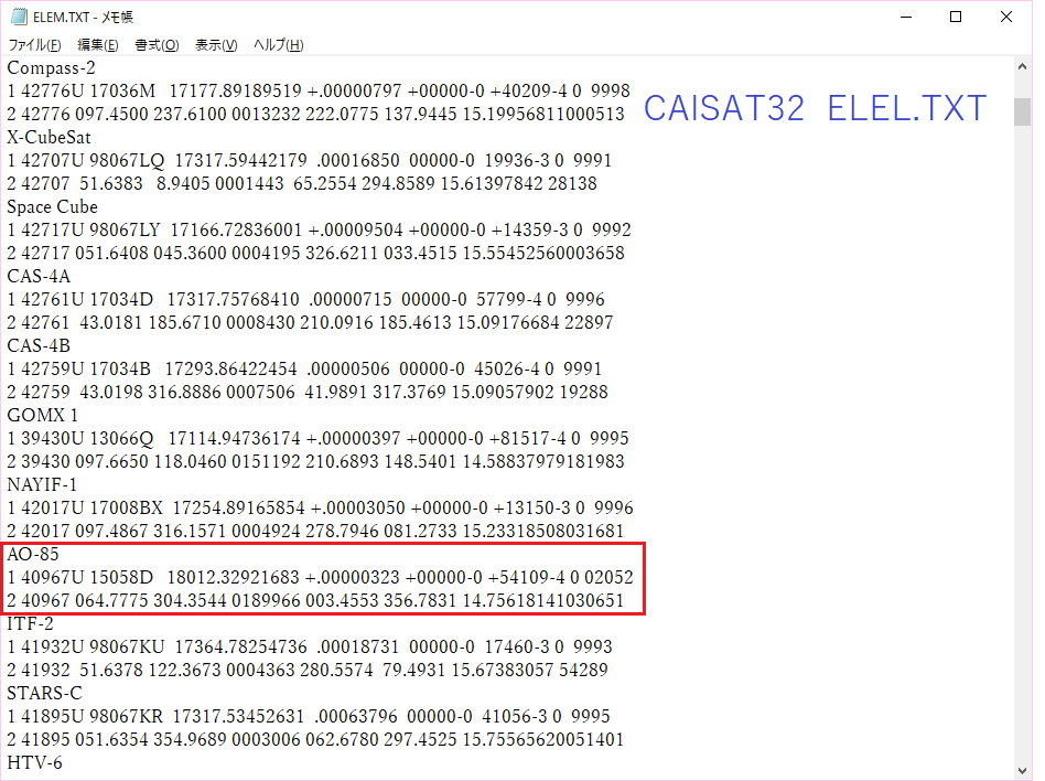 ①CALSAT32のフォルダーの中には多くのファイルがありますが、まずその中の一つELEM.TXTにAO-85のTLEを設定します(TLEの在りかについては↓衛星通信ポイント集で説明しています)