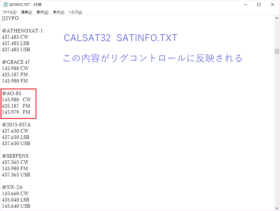 ②次に「SATINFO.TXT」に衛星の情報を書き込みます。Beacon周波数、アップ周波数、ダウン周波数となります。メモも書き込むことが出来ます。