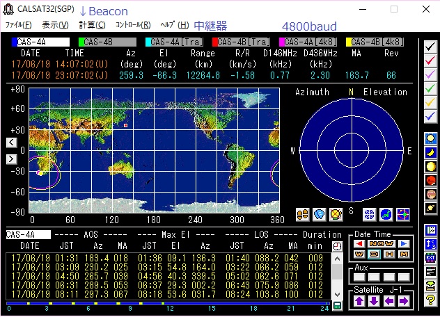 CALSAT32を立上げ、衛星の飛来を待つまでの間、リグON、アンテナローテータースイッチONしておきます。衛星が飛来したらアンテナコントロールを自動にして追尾開始します。リグコントロールはコントロール画面の「CON」「CAT」「SAT」~「FREQ」~「NOR」「DOP」と順に押します。これでリグの周波数に自動でドップラーが掛かり衛星からの信号が受信出来る状態となります。